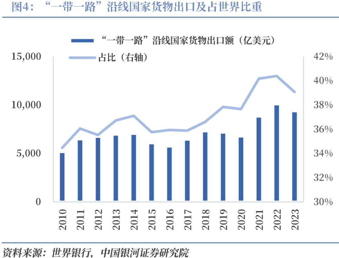 “一带一路”倡议通过设施联通、物流提效和经贸拓展,旨在构建区域融合的经贸合作。“一带一路”以铁路、公路、港口、航空等基础设施为支点,打造覆盖亚非拉的互联网络,打通发展动脉。基础建设带动物流成本下降,加之配合通关协同与制度改革,有效提升跨境贸易效率。在此基础上,经贸合作不断深化,自贸协定、产能合作和产业园区建设稳步推进。“一带一路”倡议已从愿景走向实践,沿线国家贸易出口额占世界比重将近40%,与中国的贸易投资金额也不断攀升,推动全球南方国家在互联互通与规则共建方面实现协同跃升。