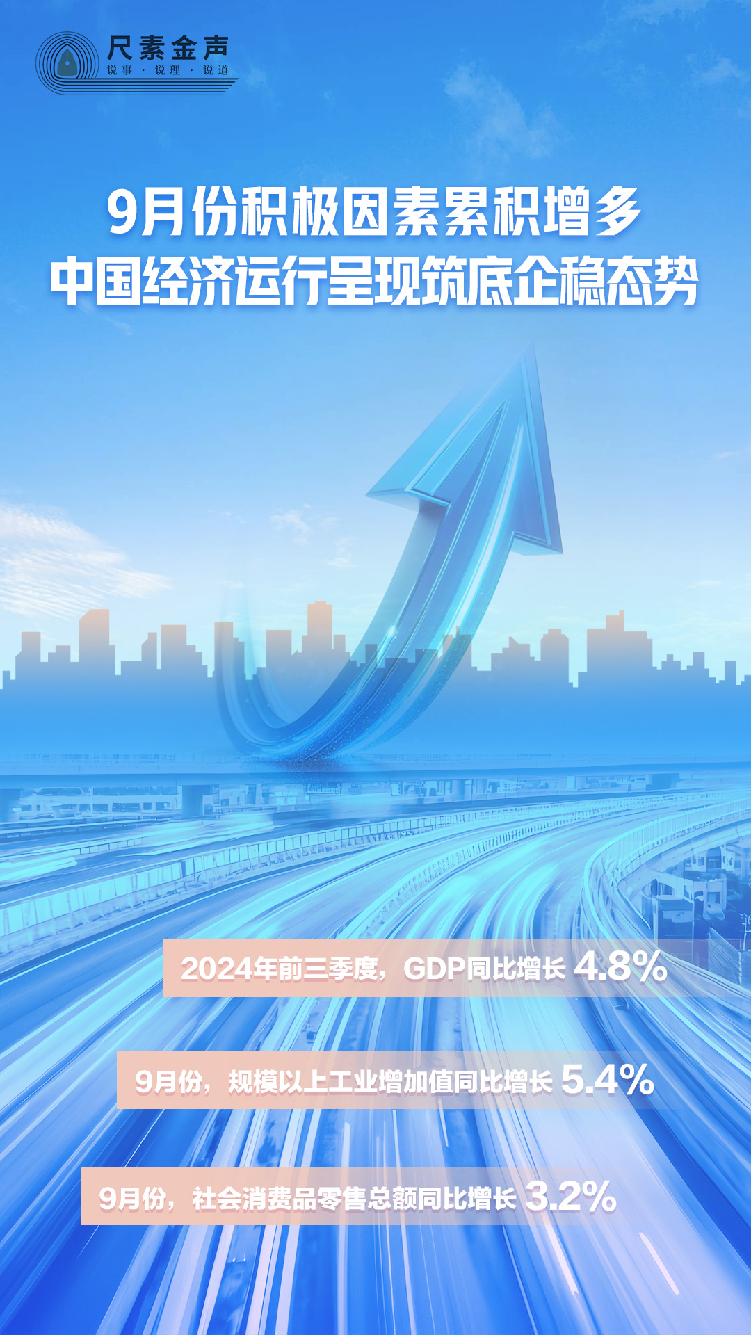10月18日,中国经济“三季报”发布:2024年前三季度GDP同比增长4.8%,经济运行总体平稳、稳中有进。尤为值得注意的是,9月份多数生产需求指标好转,市场预期改善,推动经济回升向好的积极因素累积增多,经济运行呈现出筑底企稳态势。